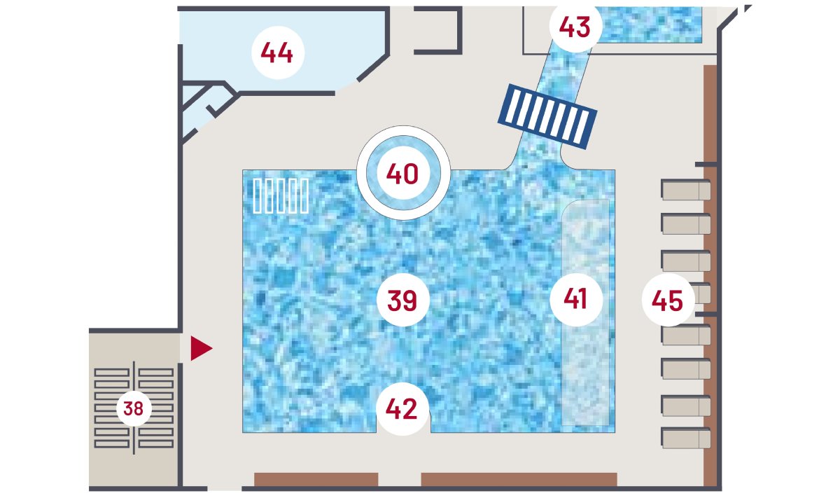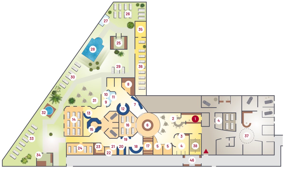 Unser Beauty & Spa Esperanto lädt auf über 4.000 qm zum Entspannen und Genießen ein. Damit Sie bei der Angebotsvielfalt vor Ort nicht den Überblick verlieren, finden Sie nachfolgend einen Lageplan zur besseren Orientierung.